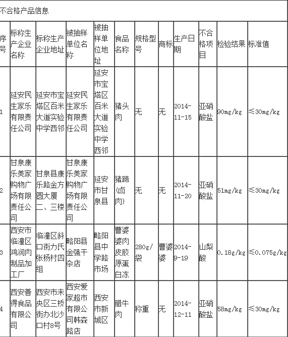 其中,肉及肉制品不合格樣品所涉及的標(biāo)稱企業(yè)、產(chǎn)品和不合格指標(biāo)為:延安民生家樂有限責(zé)任公司生產(chǎn)的豬頭肉、甘泉康樂美家購物廣場有限責(zé)任公司生產(chǎn)的豬蹄(鹵肉)、西安善得食品有限公司生產(chǎn)的臘牛肉亞硝酸鹽超標(biāo),西安市臨潼區(qū)鴻潤肉制品加工廠生產(chǎn)的曹婆婆肉皮膠原蛋白凍山梨酸超標(biāo)。