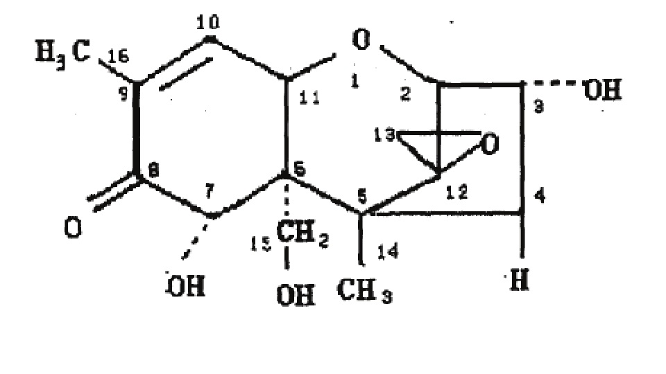嘔吐毒素是一種單端孢霉烯族毒素,主要由粉紅鐮刀菌和禾谷鐮刀菌產(chǎn)生。其化學(xué)名為3α,7α,15-三羥基-12,13-環(huán)氧單端孢霉-9-烯-8-酮,化學(xué)式為C15H20O6,純品是一種無色針狀結(jié)晶,可在乙酸乙酯和甲醇中長期保存。低劑量的嘔吐毒素,主要引起動物食欲下降、體重減輕、代謝紊亂等癥狀,大劑量可導(dǎo)致動物嘔吐。嘔吐毒素對消化系統(tǒng)、血液系統(tǒng)、中樞系統(tǒng)以及鈣磷代謝均產(chǎn)生影響,嘔吐毒素具有慢性和亞慢性毒性、急性毒性、免疫毒性等多種毒性作用。
